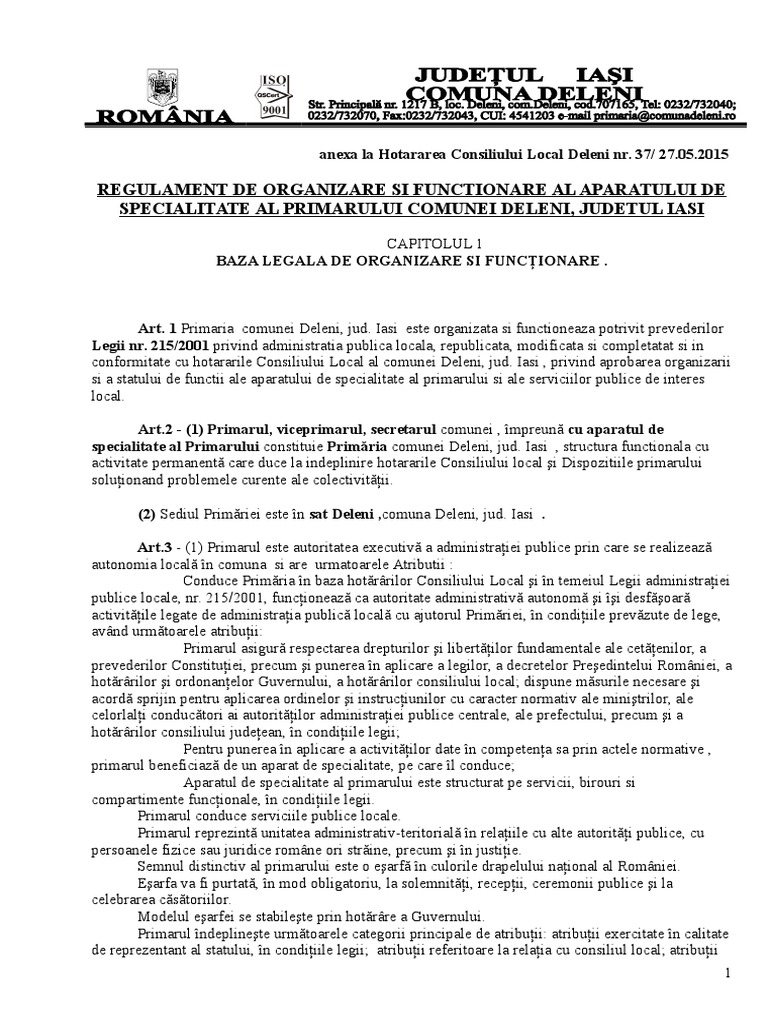 Regulament De Organizare Si Functionare Al Aparatului De Specialitate Al Primarului Comunei Deleni Definitiv