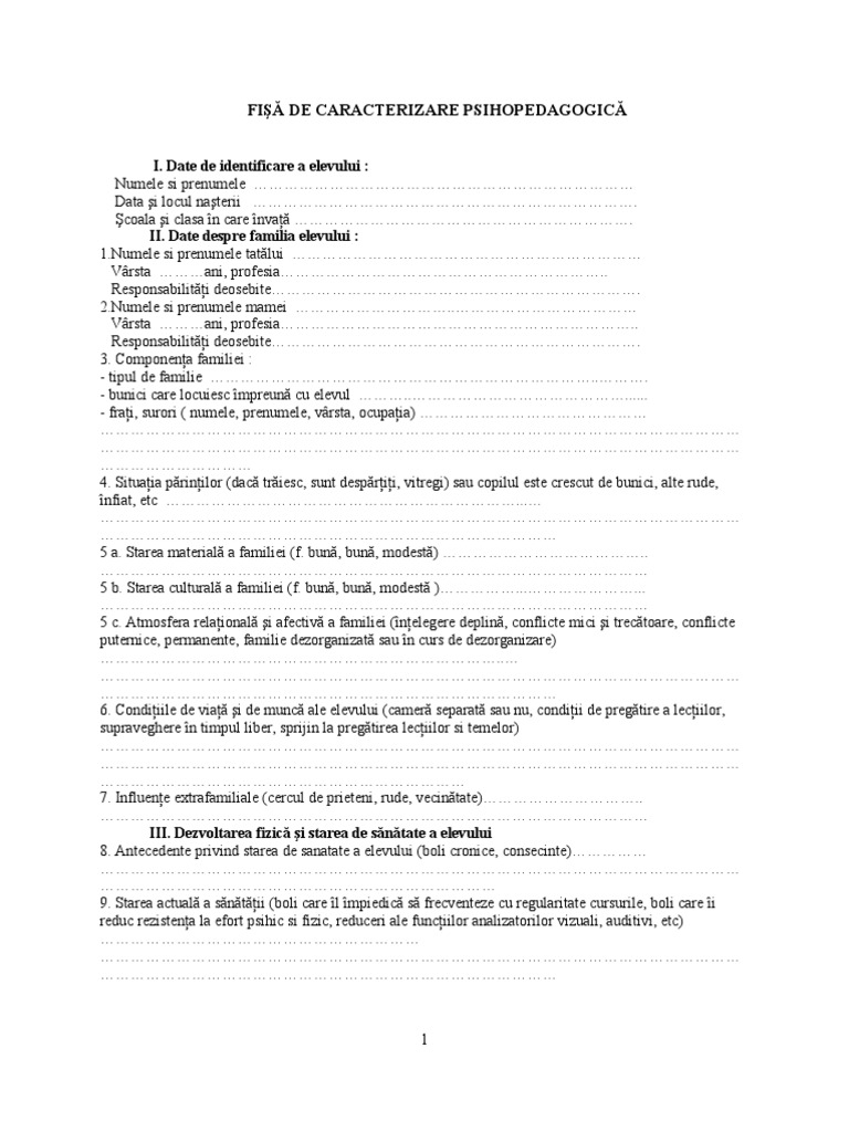 Fisă De Caracterizare Psihopedagogică Si Socială A Elevului