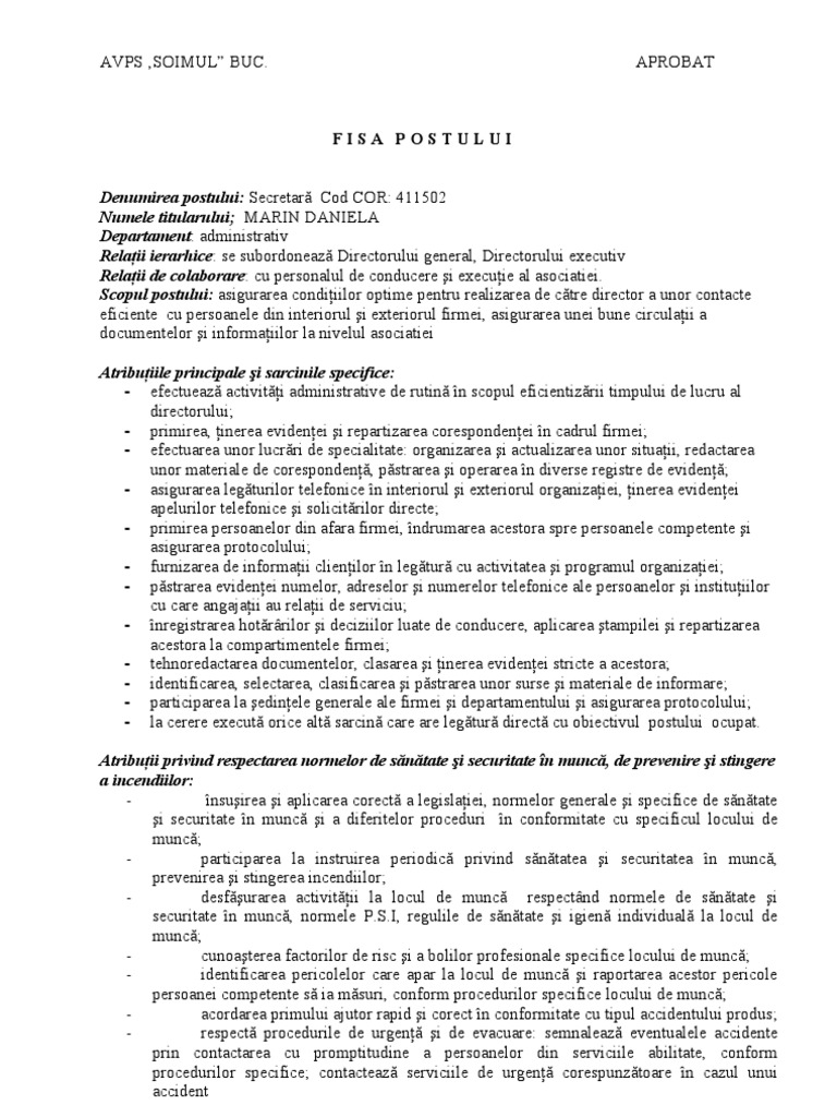 Fișa Postului și Fișă De Evaluare A Performanțelor Individuale Pentru Secretar Administrativ Cod Cor 334301