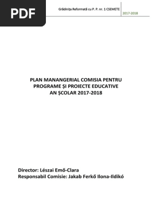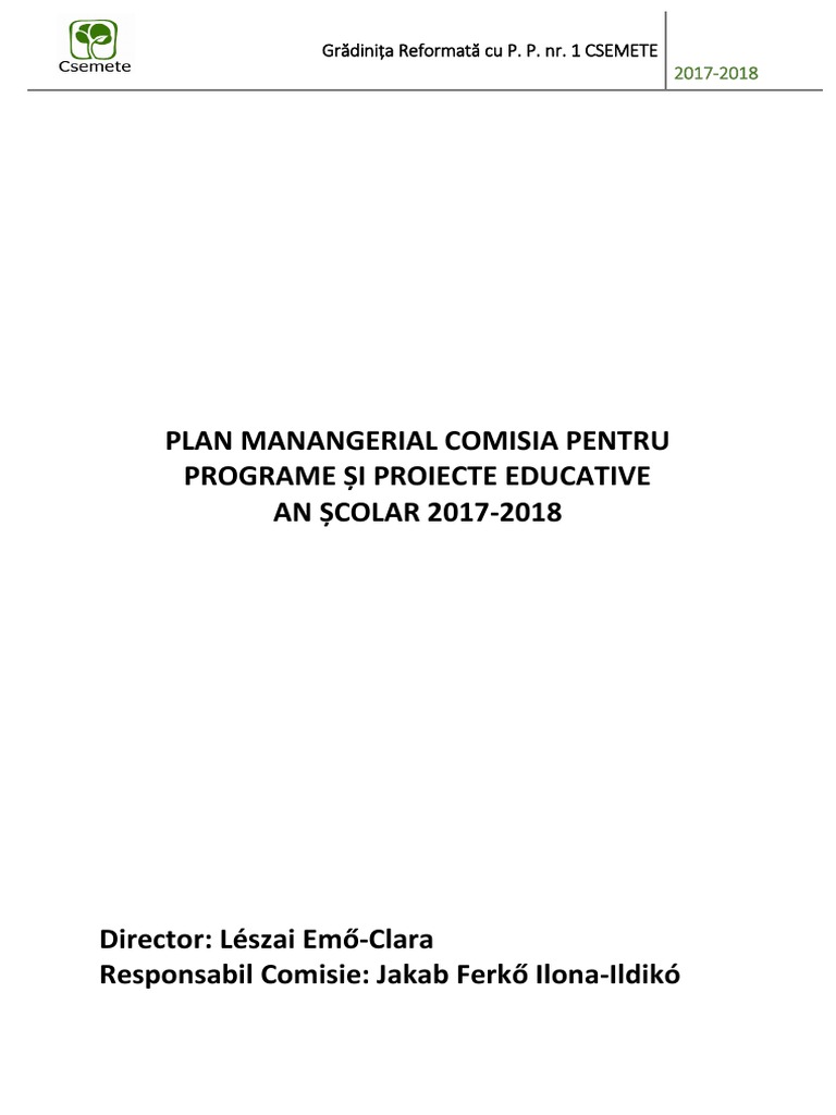 Plan Manangerial Comisia Pentru Programe și Proiecte Educative An școlar 2017 2018