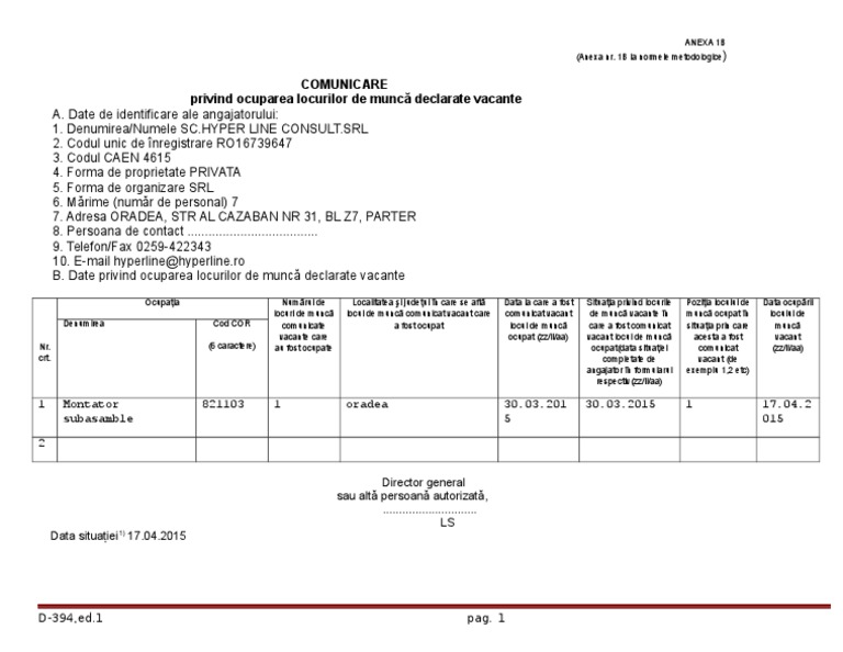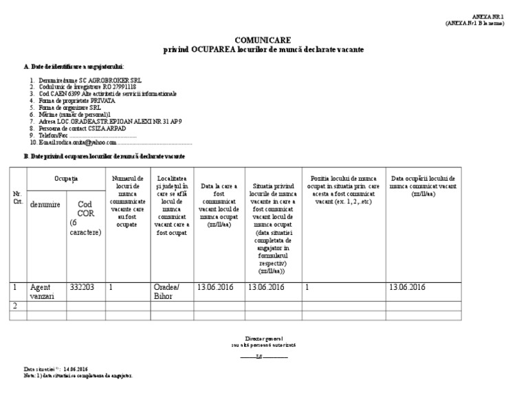 Anexa 1b Comunicare Ocupare Locuri De Munca Declarate Vacante