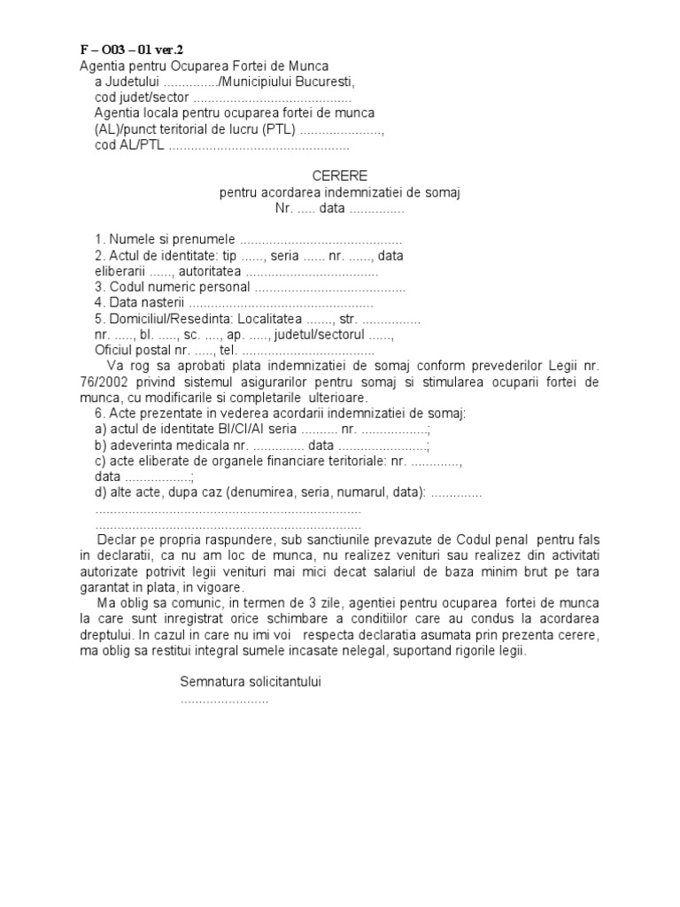 Cerere Pt Acordarea Indemnizatiei De Somaj