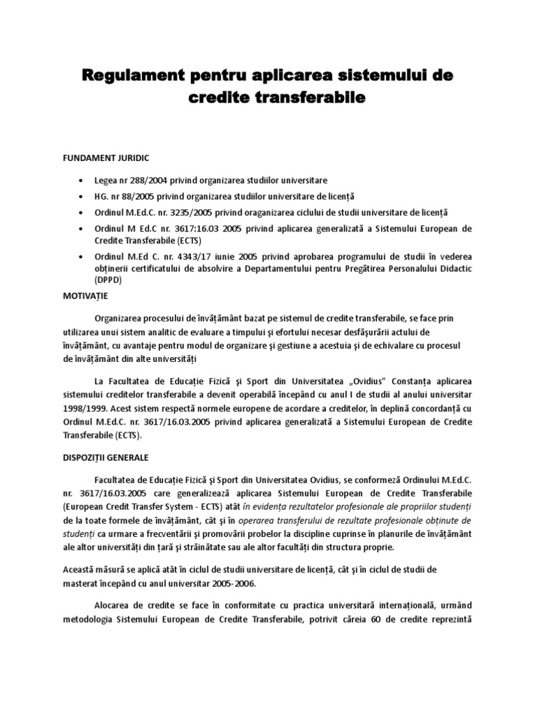 Regulament Pentru Aplicarea Sistemului De Credite Transferabile
