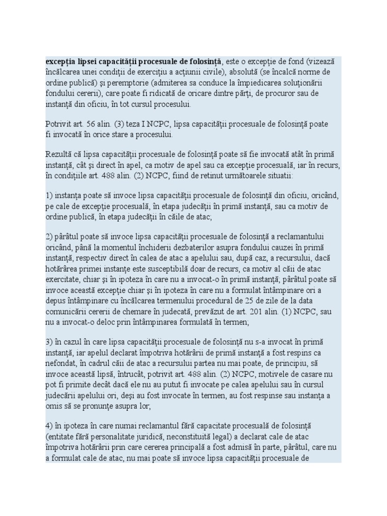 Excepţia Lipsei Capacităţii Procesuale De Folosinţă