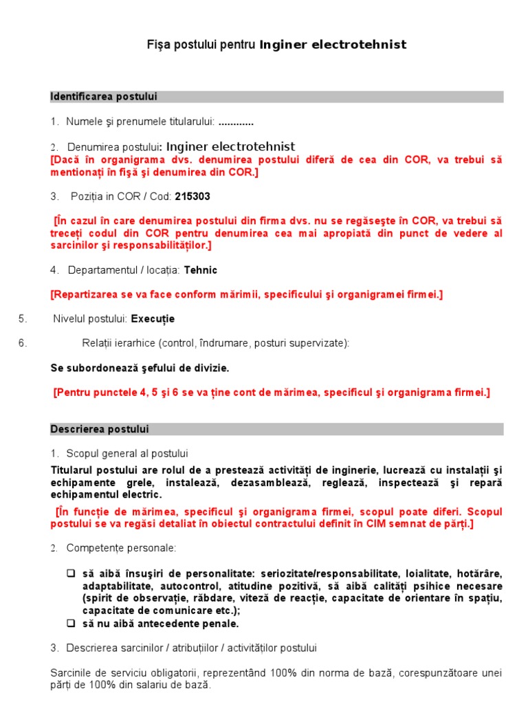 Fisa Postului Pentru Inginer Electrotehnist
