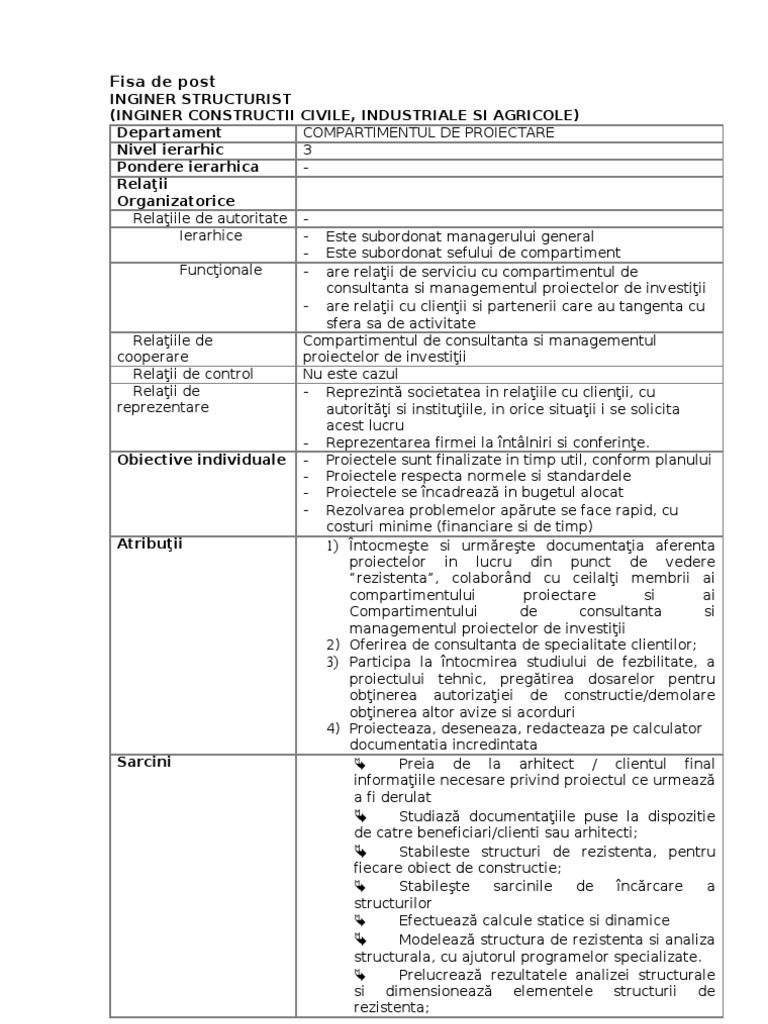 Fisa De Post Inginer Structurist