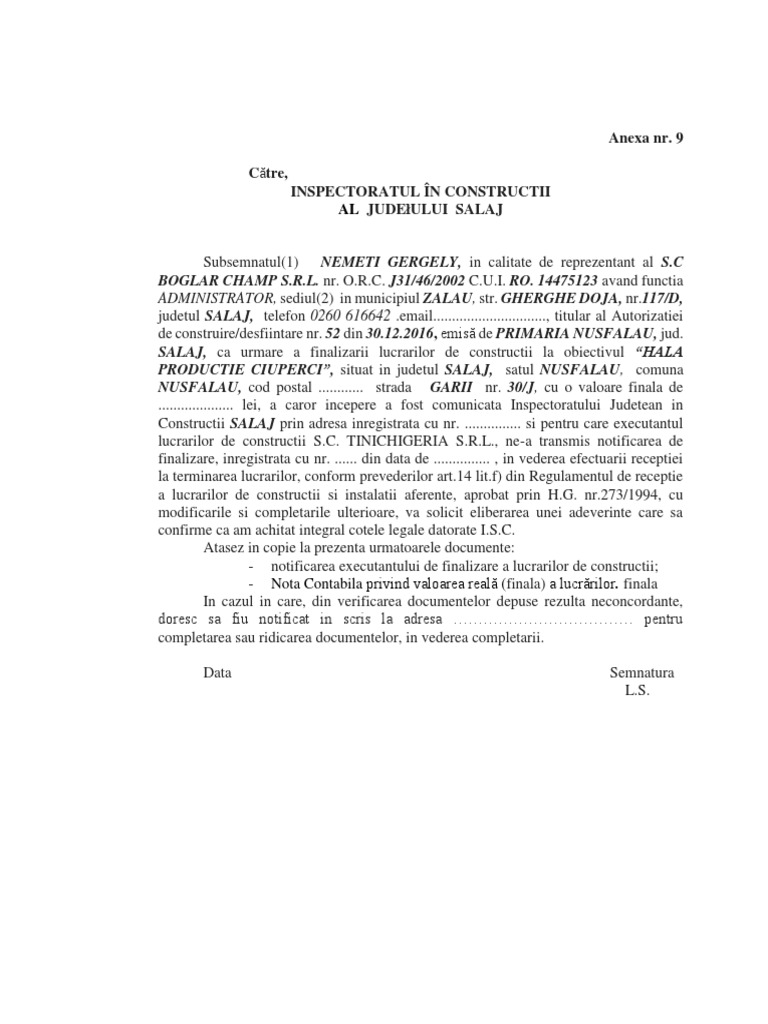 Cerere Invitatie Receptie La Terminarea Lucrarilor De Constructii