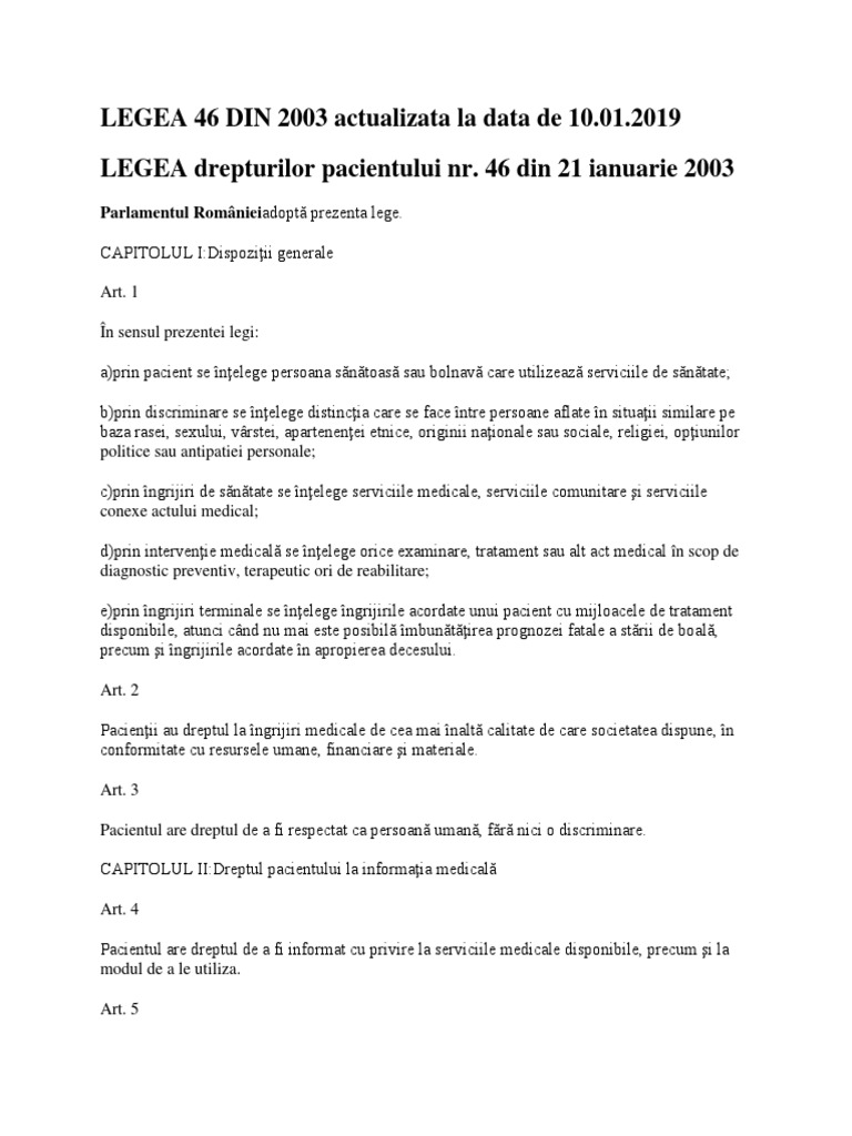 Lege Nr 46 2003 Drepturile Pacientului Doc Doc