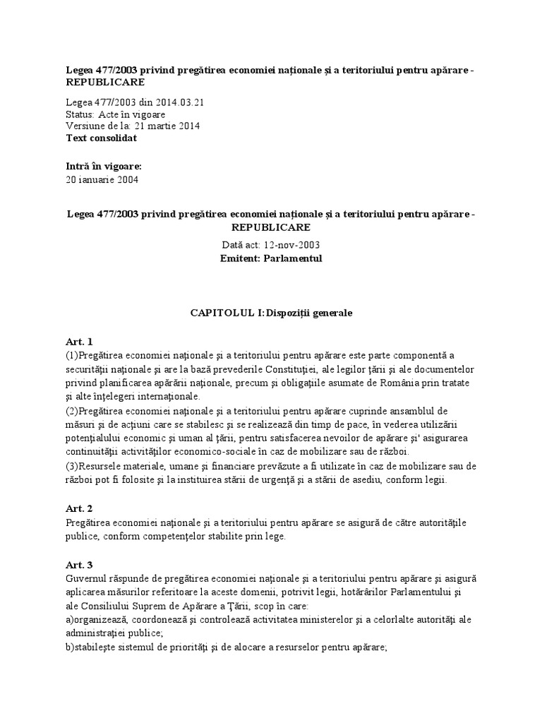 Legea 477 2003 Privind Pregătirea Economiei Naţionale Si A Teritoriului Pentru Apărare