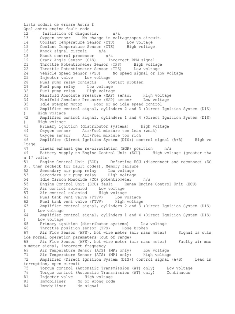 Coduri Opel Astra F Fuel Injection Throttle