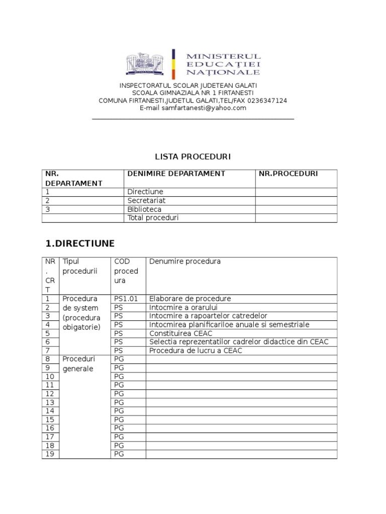 1 Directiune Lista Proceduri