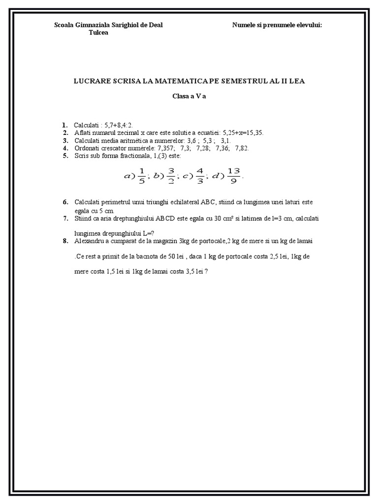 Lucrare Scrisa La Matematica V