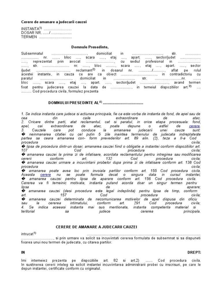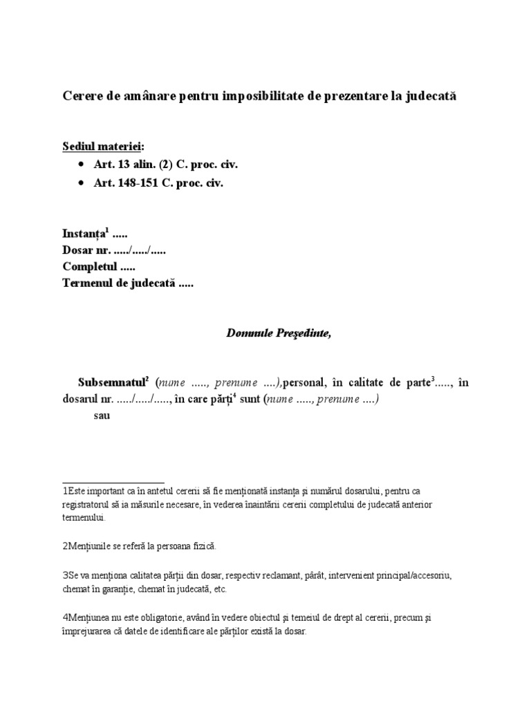 Cerere De Amanare Pentru Imposibilitate De Prezentare La Judecata