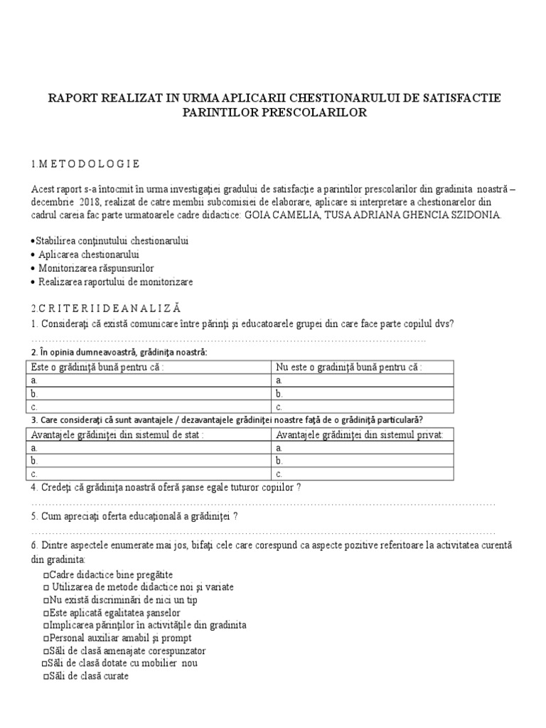 Raport Realizat In Urma Aplicarii Chestionarului De Satisfactie Parintilor Prescolarilor