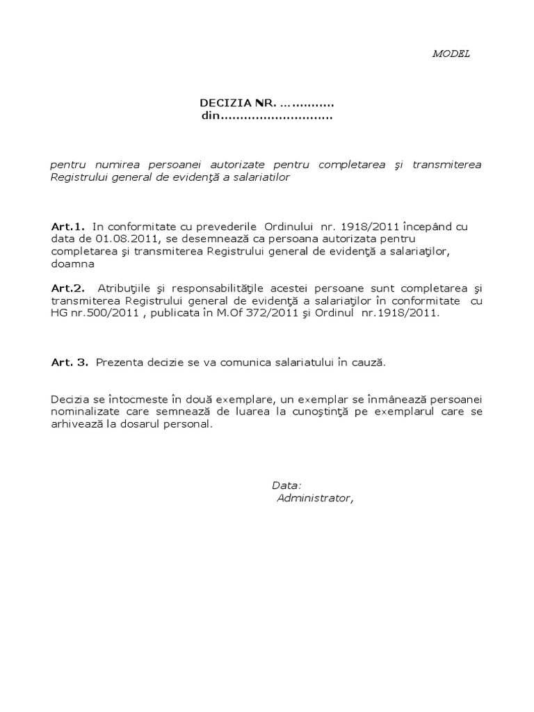 Revisal Model Decizie Nominalizare Persoana Pentru Completarea Si Transmiterea Registrului