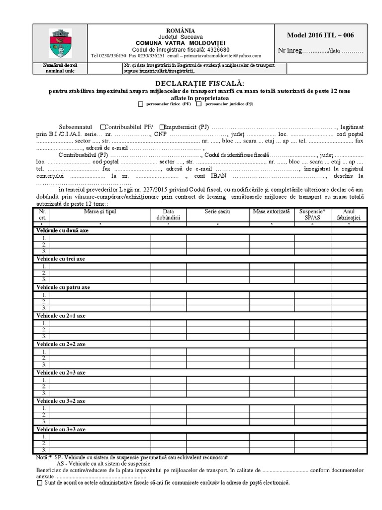 Anexa 6 Model Declaratie Fiscala Stabilire Impozit Mijloace De Transport Marfa Peste 12 Tone Pf Si Pj
