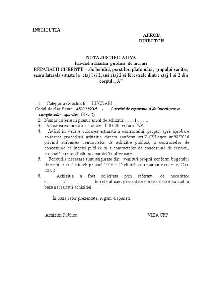 Model Nota Justificativa Achizitie Directa 2018