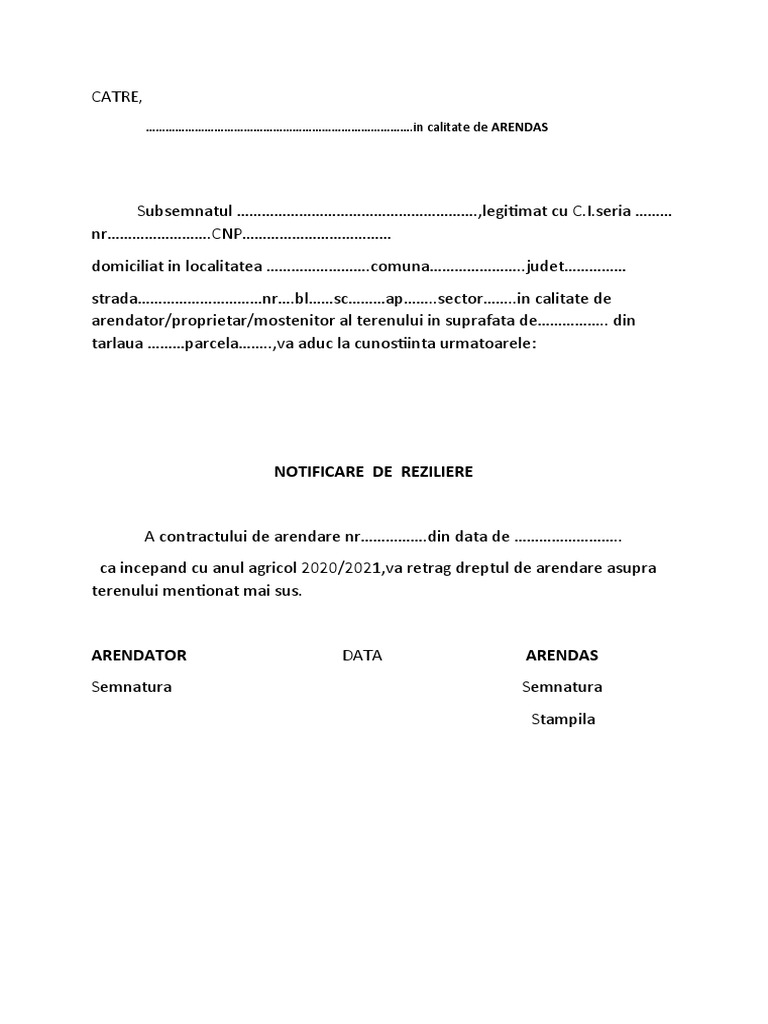 Model reziliere contract arenda teren agricol. D să plătească arenda la termenele şi în modalităţile stabilite în prezentul contract. B sa il garanteze pe arendas de evictiune totala sau partiala precum si de viciile ascunse ale lucrului pe care il arendeaza. Multumesc pentru raspuns dar in contract nu exista nici un fel de clauza cu privire la rezilierea inainte de termen. Arendaşul poate schimba categoria de folosinţă a terenului arendat numai cu acordul scris al arendatorului şi cu respectarea prevederilor legii.