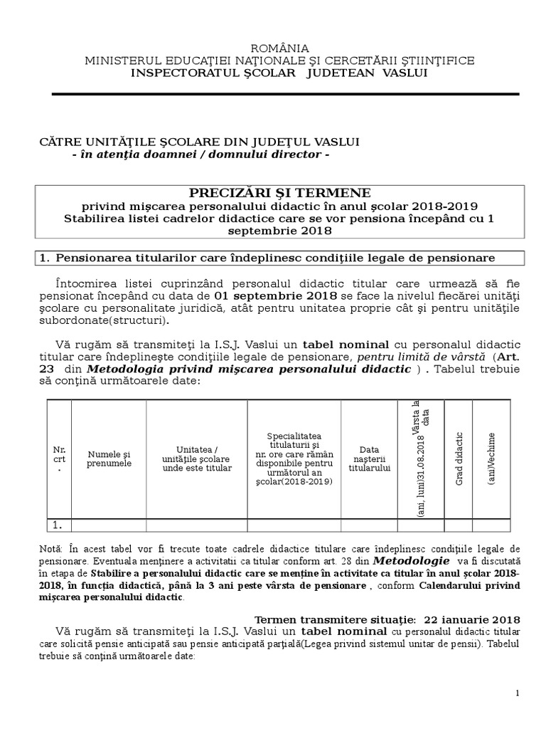Stabilirea listei cadrelor didactice care se vor pensiona începând cu 1 septembrie 2018.