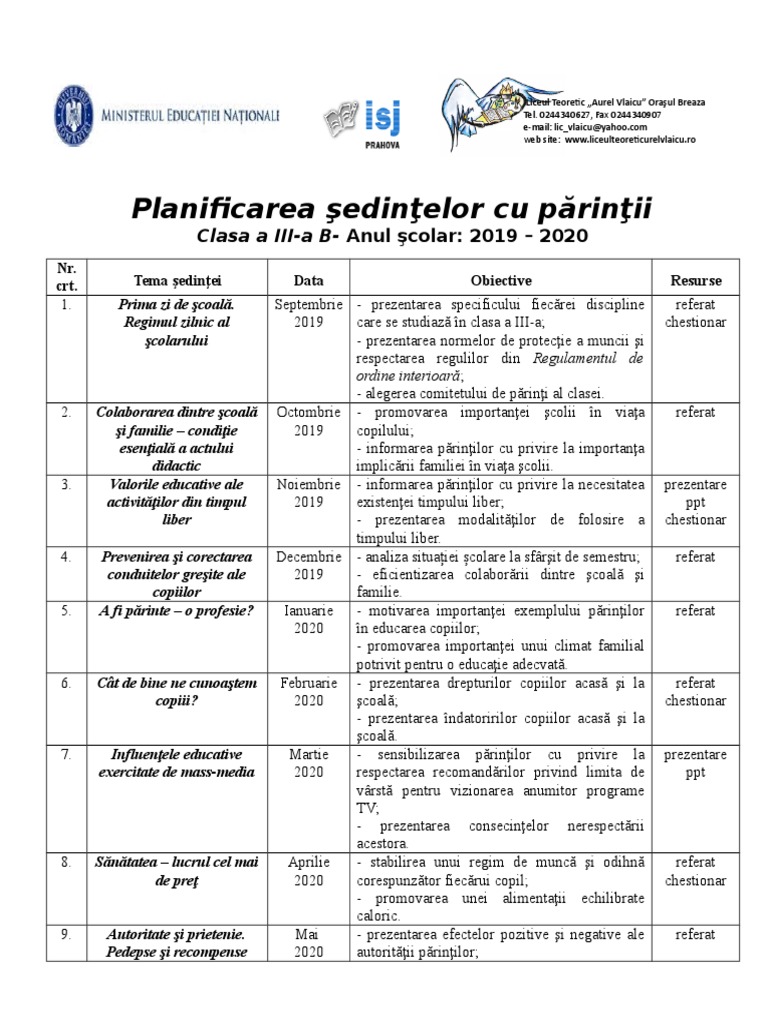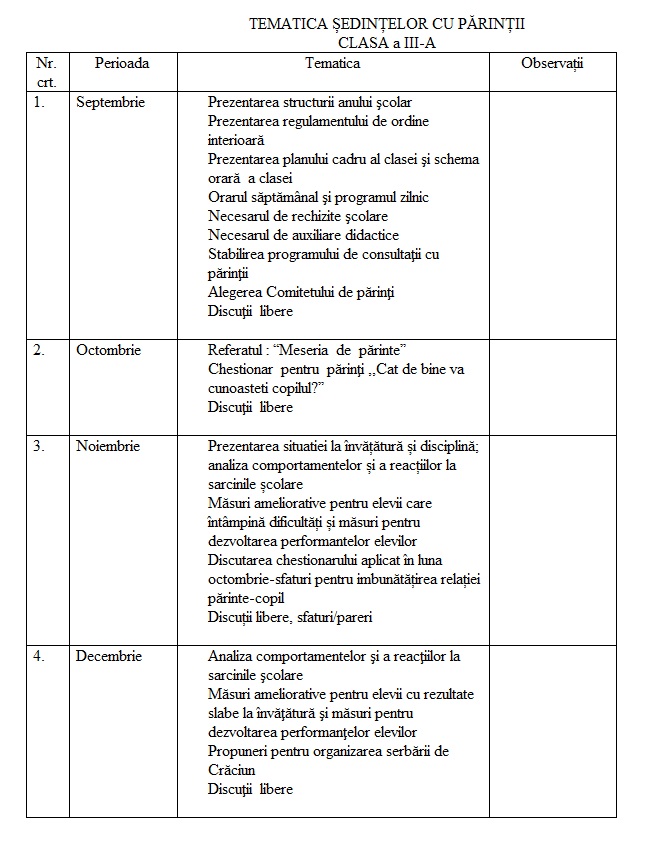 Planificarea Sedintelor Cu Parintii Clasa 3
