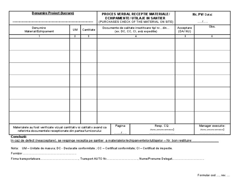 Formular Receptie Materiale In Santier