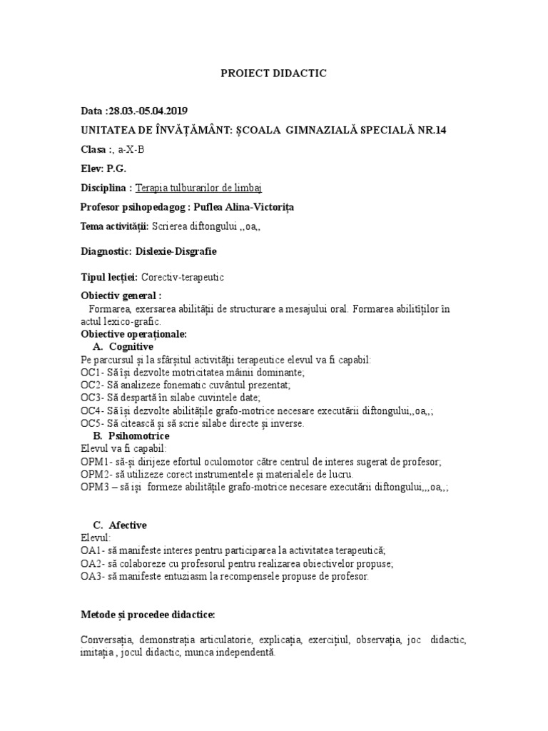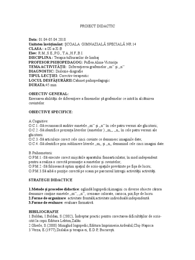 Proiect Didactic Logopedie Dislexie Disgrafie