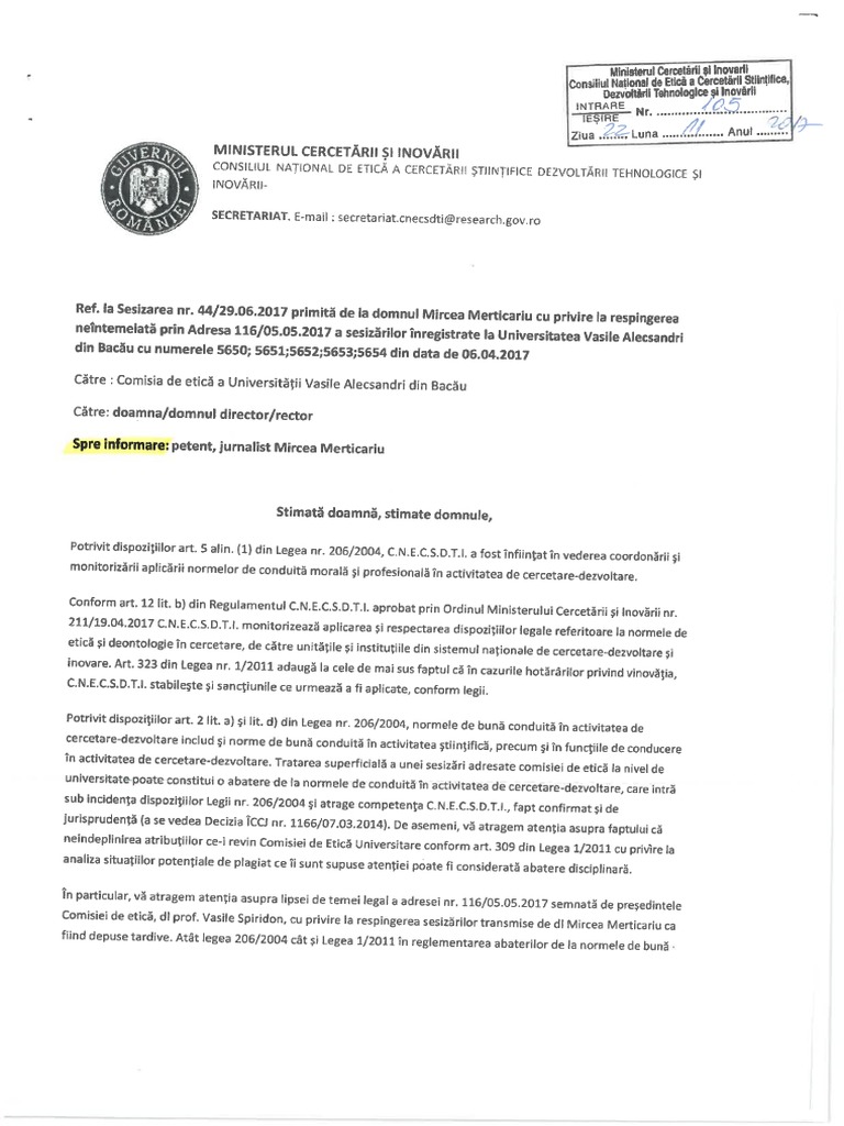 Comisia De Etica A Universitatii Vasile Alecsandri Din Bacau A Incalcat Legea Document De La Ministerul Cercetarii Si Inovarii