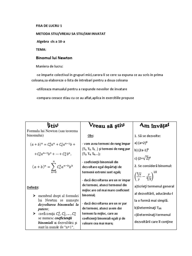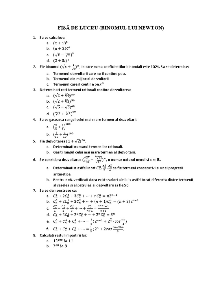 Fisa De Lucru Binomul Lui Newton