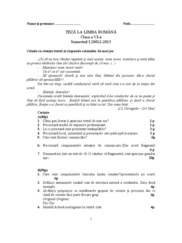 Model De Teza La Limba Romana Clasa 6 Semestrul 1 Pdf Document